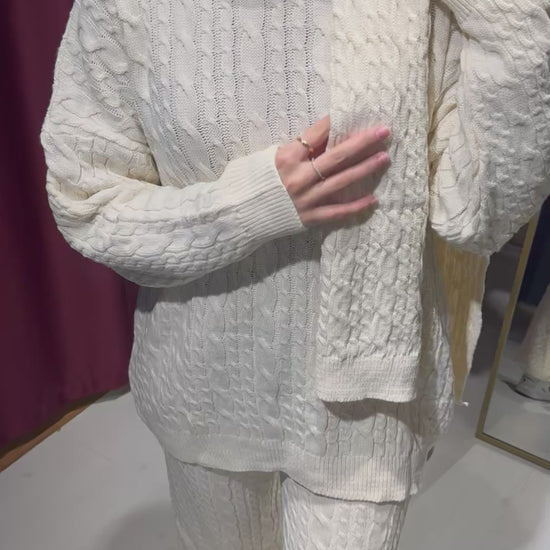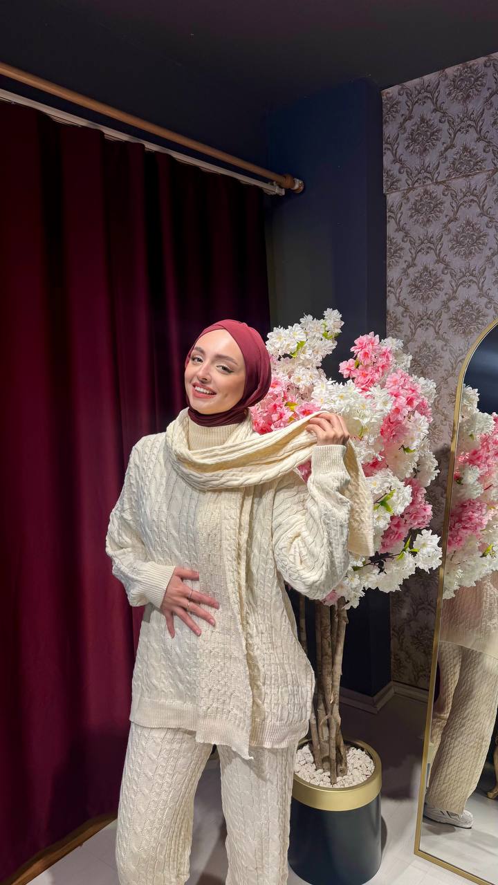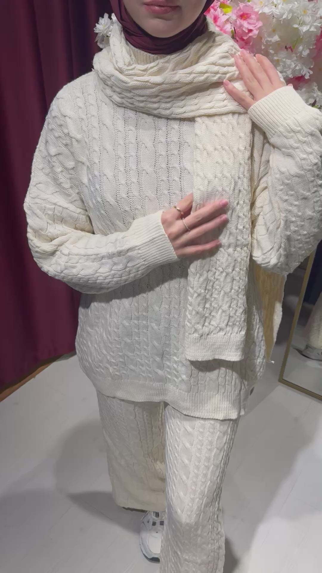 Bu üçlü örgü takım; kazak, pantolon ve atkıdan oluşuyor.