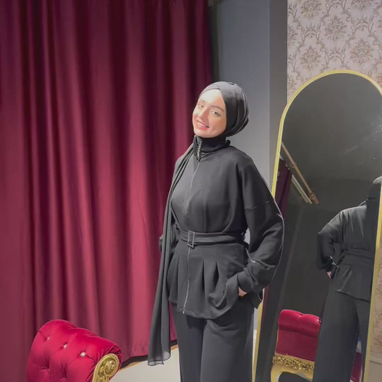Akışkan dokusu, dökümlü pantolonu ve kemer detayıyla ister günlük ister ofis kombinlerinde kullanabilirsiniz.
